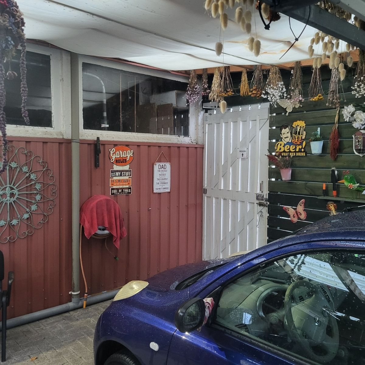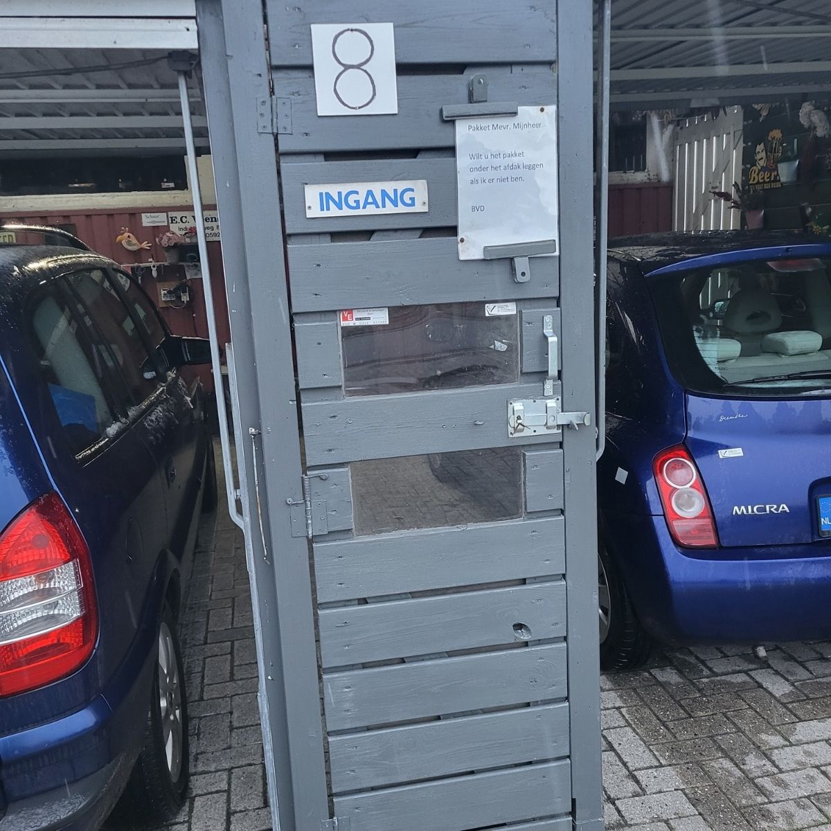 Achter de linker garagedeur staat mijn auto – daarachter mag je parkeren.