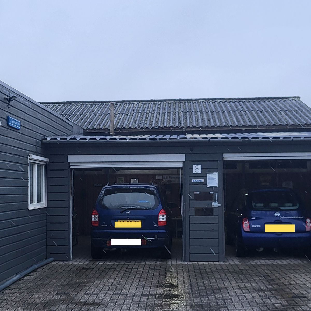 Voor het gebouw zie je twee garagedeuren.